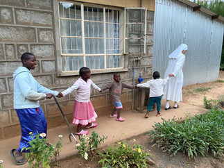 The SSV Mission in Ol Moran operates a rescue home for children with disabilities and homeless young adults who need care due to emotional and physical health issues. The children of Magnificat House are under the loving and watchful care of Sr. Mary who keeps them laughing and smiling due to her fun and kind nature. There is room to roam and play and plenty of animals to watch and sometimes chase. Magnificat House shares a large space of open grass adjacent to the garden and farm with playground swings and climbing gym. Two young mothers who are also residents with the children assist the sisters in caring for the children, keeping house, meals and laundry. Many hands are needed at mealtime because some of the small children are profoundly disabled and require one-on-one assistance.