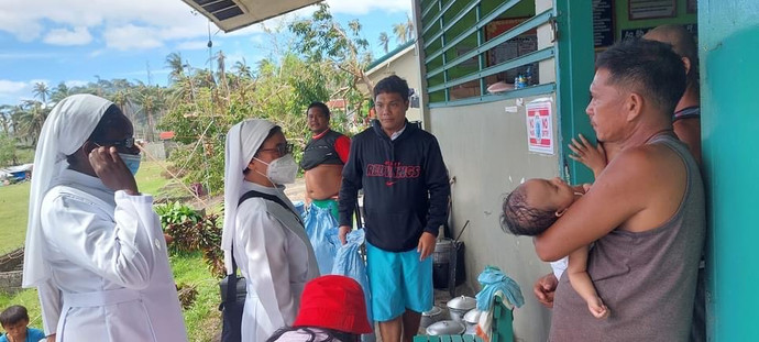On December 21, 2021 the Sisters Servants of the Visitation made a mission trip to the devastated area of Southern Leyte hit by Super Typhoon Odette on December 18th. SR. Rubi., SSV and Sr. Jennelyn, SSV made the 7 hour trip in two vans loaded with aid supplies to reach the victims of the typhoon who lost everything in the storm. Sr. Rubi reports the scenes were of complete devastation with villages completely wiped out, no shelter left, little food, little clean water, and children begging for food along the road. The first area they stopped was Maasin in search of the family of an SSV Sister, Sr. Maravic, SSV in hope they were alive and their home was spared. The Sisters found the family intact living in a makeshift lean-to shelter with tarps for cover but everyone was safe, thanks be to God..